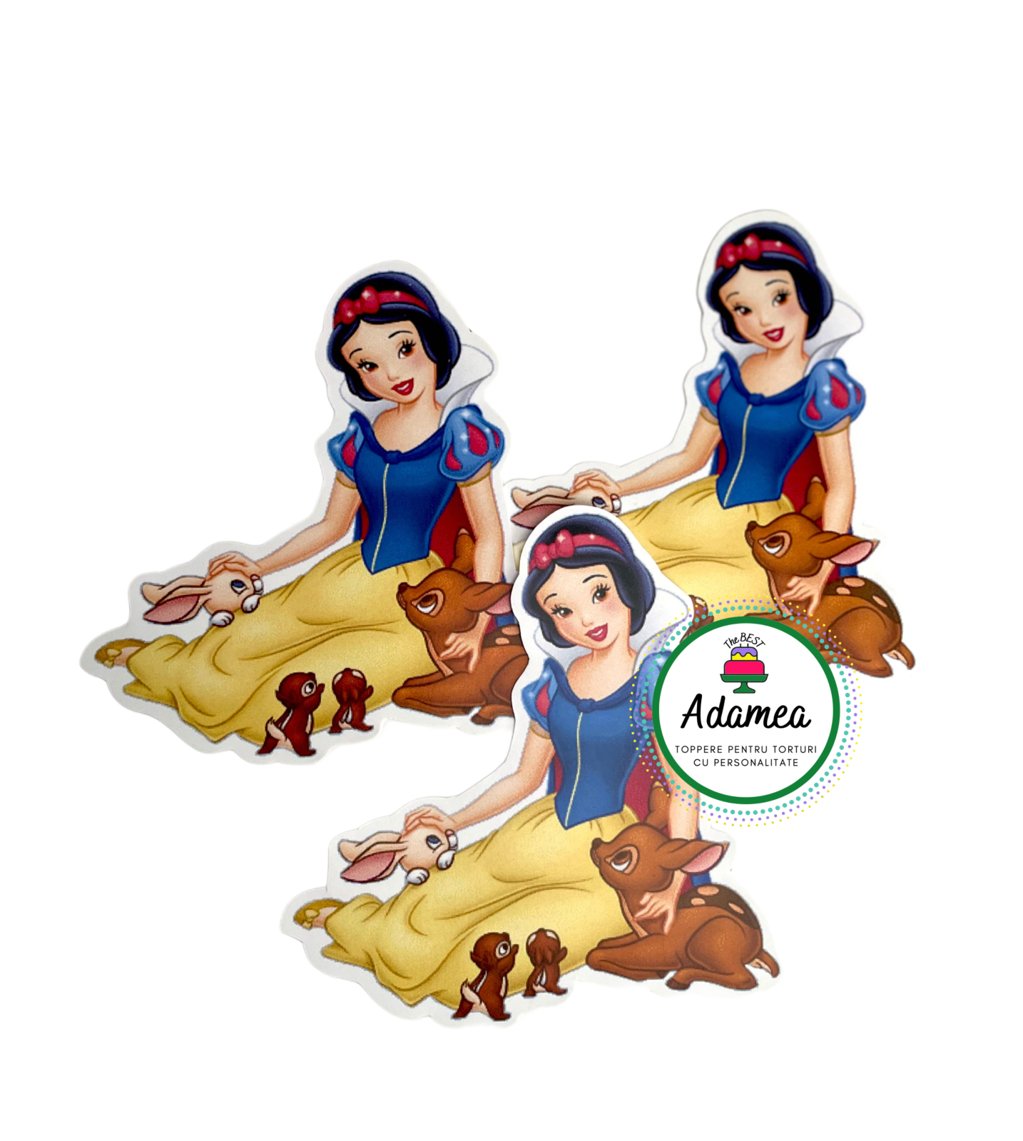 Topperul surprinde perfect farmecul clasic al poveștii, cu Albă ca Zăpada așezată elegant, înconjurată de un iepuraș, o căprioară și două veverițe curioase — un simbol al bunătății și al naturii prietenoase.