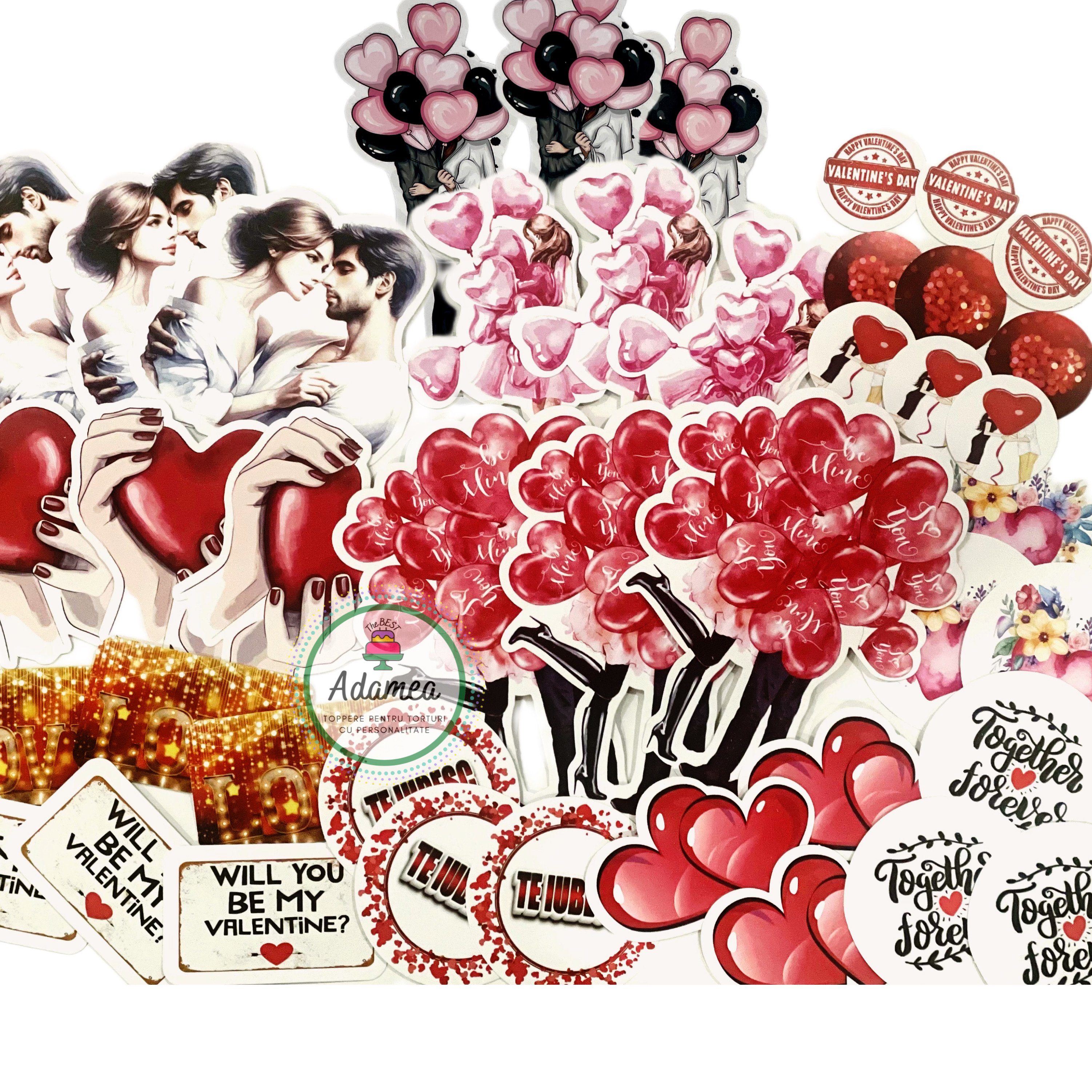 Inima este elementul central al decorurilor de Valentine’s Day, iar la Adamea există peste 100 de modele de toppere cu inimioare, în stiluri variate: simple, romantice, grafice sau jucăușe.