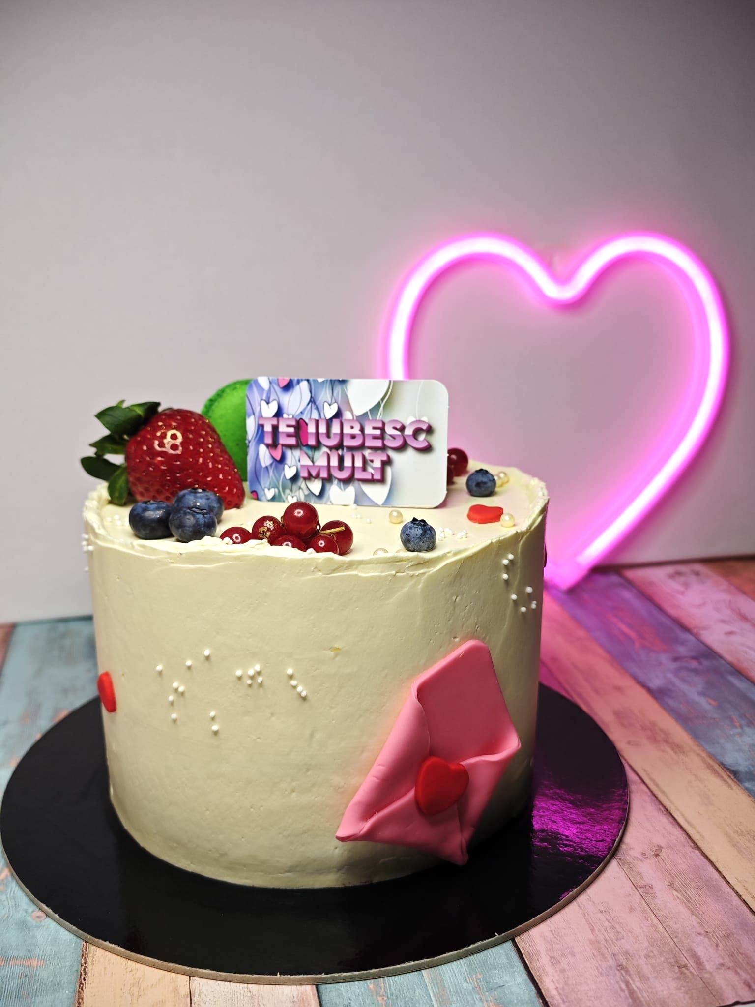 Un topper cu inimioare stilizate, amplasat central, pe un tort monocrom sau cu glazură fină, poate deveni piesa principală a decorului, fără a mai fi nevoie de flori din zahăr sau figurine comestibile.