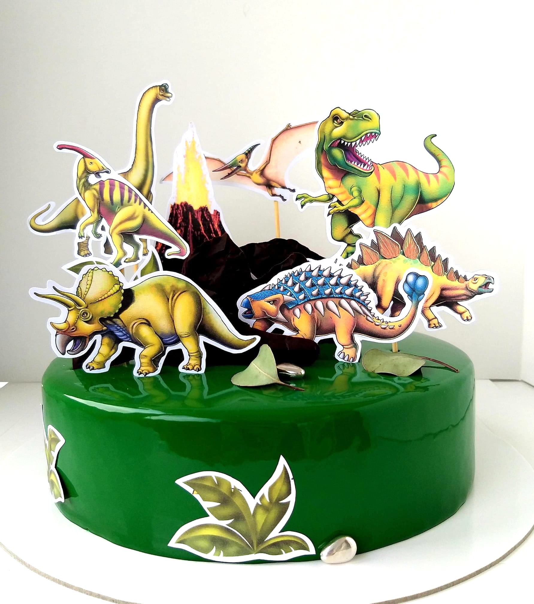Frunzele (de palmier/junglă) adaugă instant vibe de natură – tortul nu mai e doar “tort”, devine “lumea dinozaurilor”.