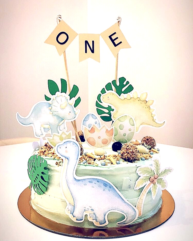 • Suită cu dino + banner ONE – perfectă pentru prima aniversare, mai ales dacă vrei un tort “smash” super fotogenic.