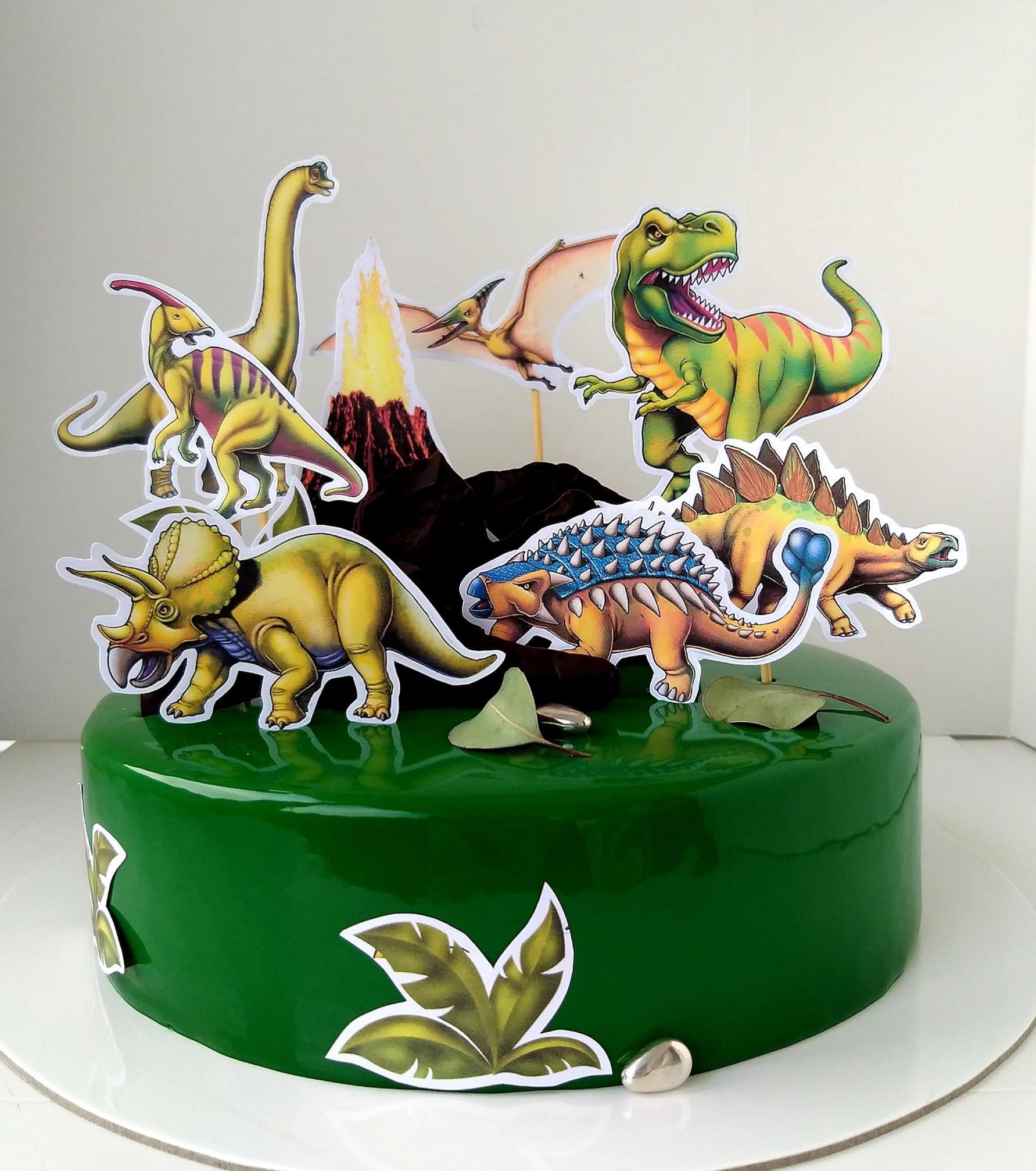 Tort verde cu vulcan și mai multe specii de dinozauri – perfect pentru un efect 3D.