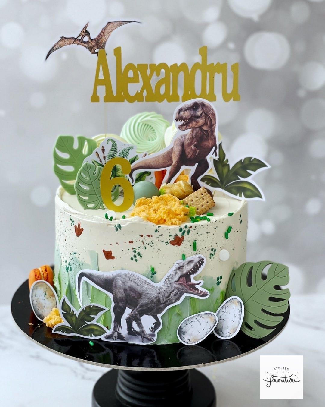 Tort personalizat cu ouă de dinozaur și numele sărbătoritului.