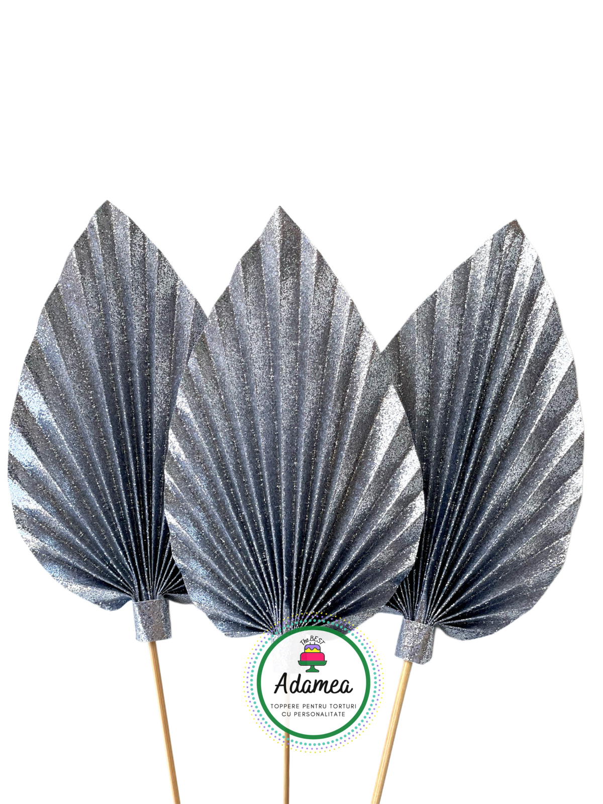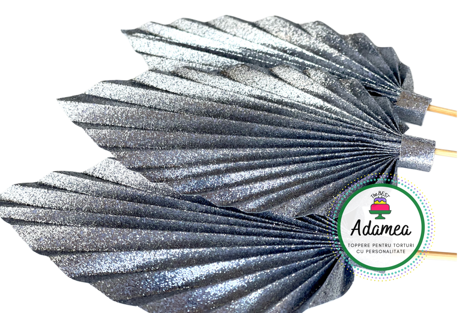 O piesă spectaculoasă, cu aer festiv și strălucire rece ca iarna. Frunza palmier glitterată argintiu este realizată din carton premium, acoperit cu sclipici fin, ce reflectă lumina într-un mod elegant și luxuriant. Finisajul texturat și forma plisată oferă volum real, ca un evantai delicat, făcându-l perfect pentru torturi moderne, tematice sau glamour.