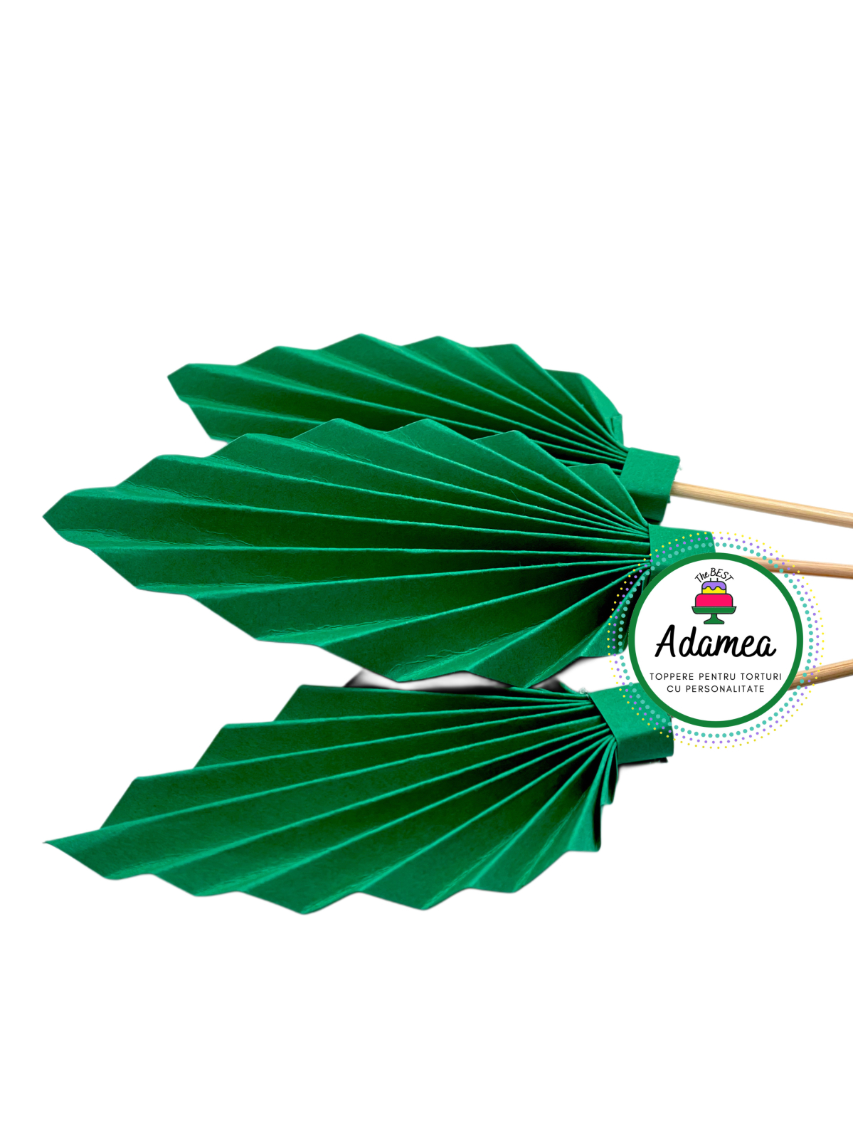 Evantaiul decorativ mini verde este alegerea perfectă pentru torturi moderne, delicate și compoziții minimaliste. Cu un design inspirat din frunzele tropicale, acest ornament adaugă volum și prospețime decorului, fără să încarce vizual tortul.