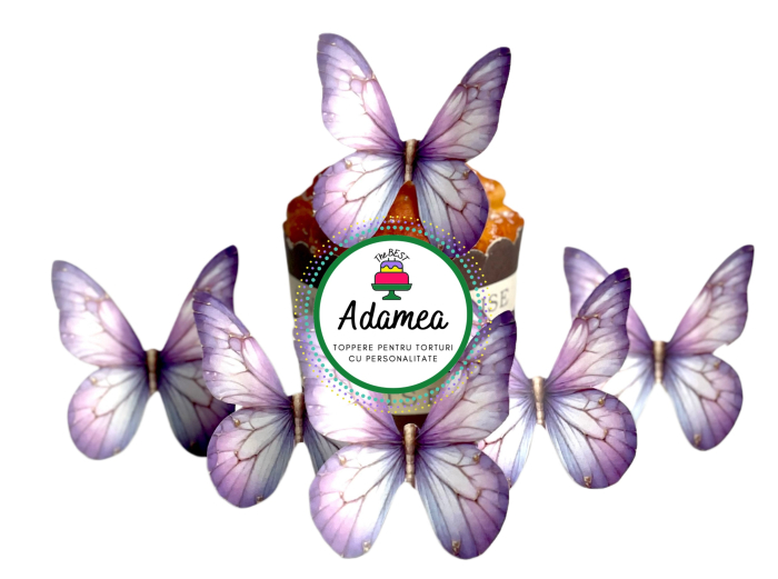 Un set spectaculos de 6 fluturi decorativi în nuanțe de mov, cu inserții discrete tip glitter, care captează lumina și adaugă un strop de magie fiecărui tort. Aripile delicate, cu efect ușor translucid și accente strălucitoare, creează impresia de mișcare și rafinament, transformând tortul într-un adevărat punct de atracție.