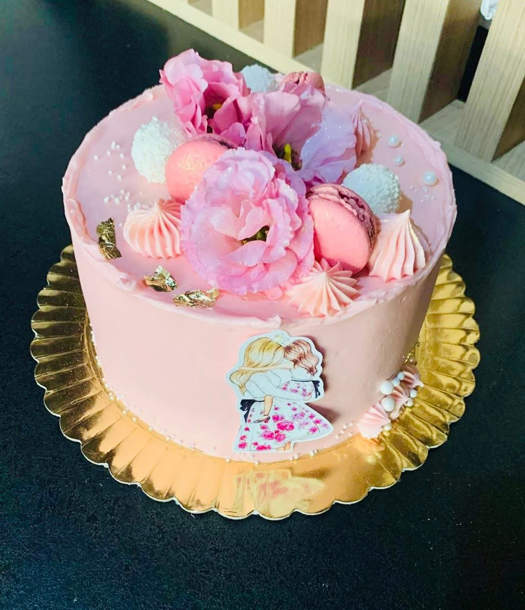 Topper frontal cu mama și fiica, cu haine identice, cu flori decupate cu contur alb. Topperul este realizat din carton și e texturat pe o parte, spatele lui fiind alb. Are 10cm înălțime.