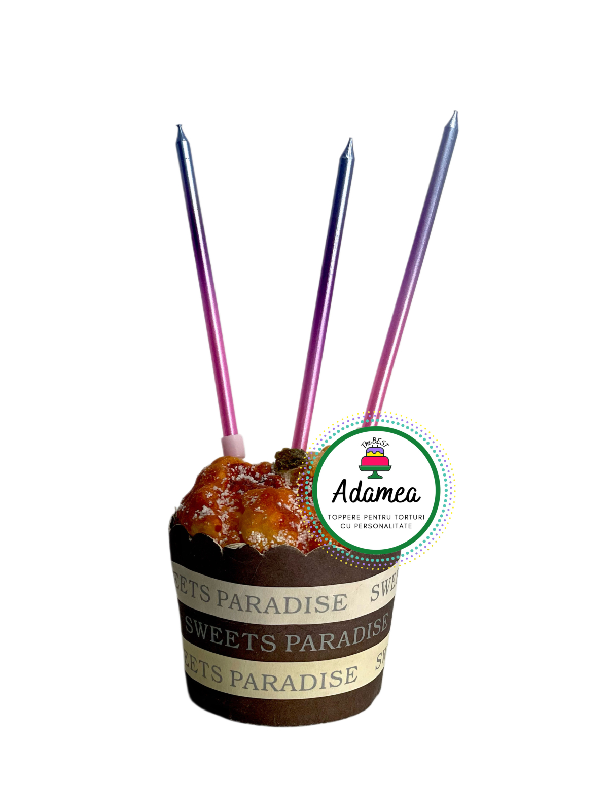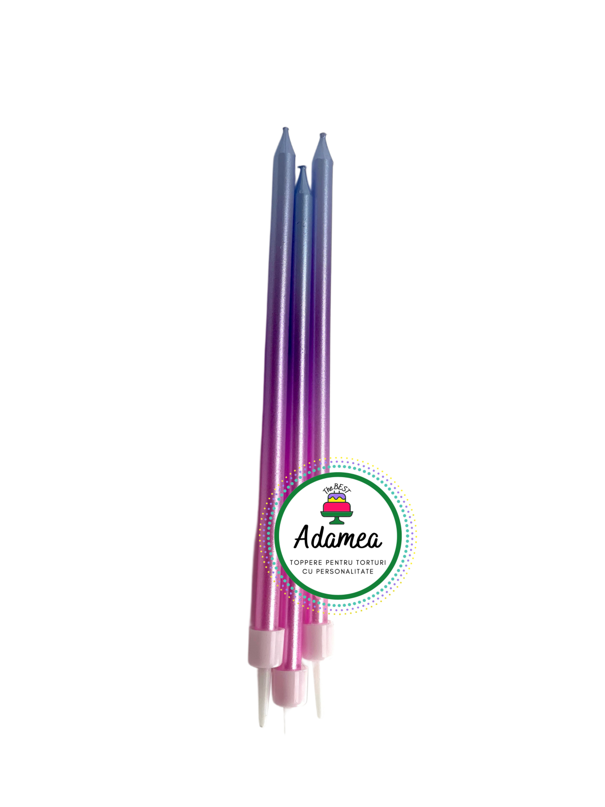 Un set delicat și modern de 3 lumânări drepte cu efect degrade, în nuanțe armonioase de bleu, mov și roz, creat pentru torturi care vor să transmită eleganță, prospețime și un aer festiv contemporan. Tranziția cromatică este fină și echilibrată, oferind un accent vizual rafinat fără a domina decorul tortului.