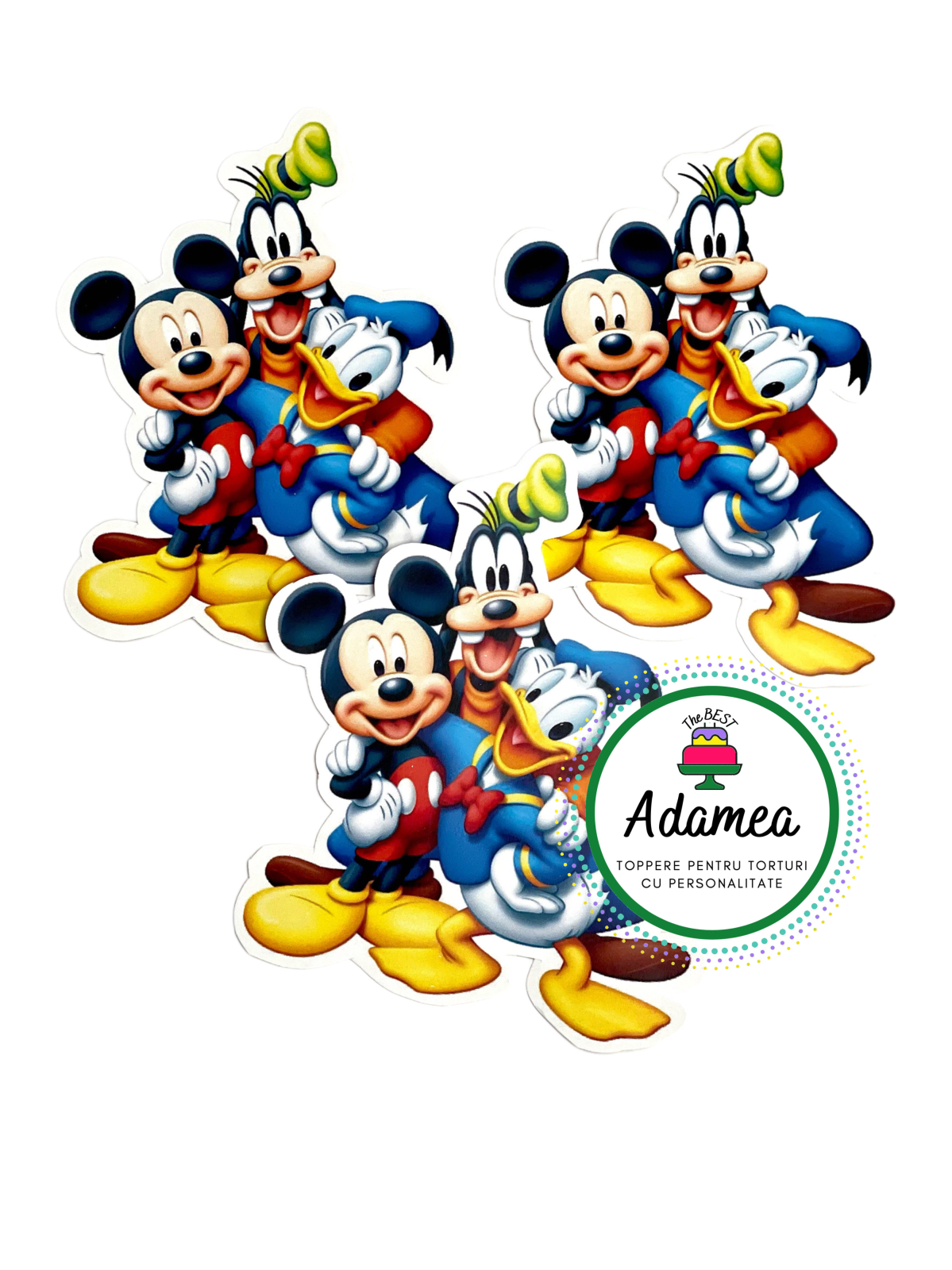 Topper cu Mickey, Donald și Goofy, 10 cm lățime, preț per bucată. La cerere poate fi montat pe băț pentru amplasare sus pe tort.