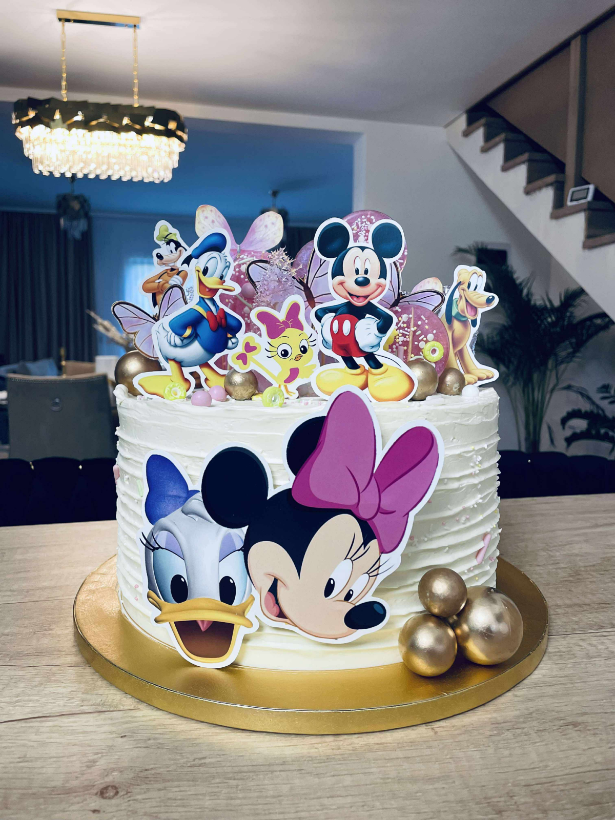 Suită de toppere din carton gros, printat pe o parte, spatele lui fiind alb. Setul conține un topper mare, frontal, de 12,5cm înălțime și alte 5 figurine pe băț (Mickey, Donald, Goofy, Pluto și canarul).