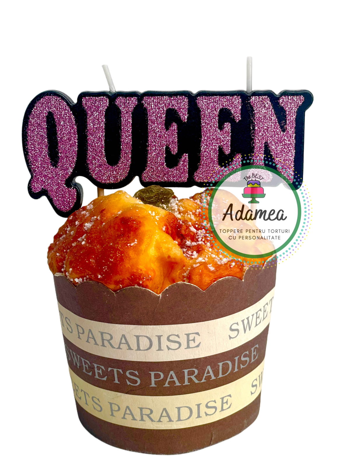 Lumanarea topper „Queen” cu sclipici roz este acel detaliu care aduce eleganță, strălucire și un strop de glam la orice aniversare.