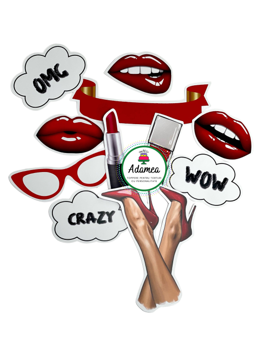 Setul conține un topper frontal cu picioare sexy în pantofi stiletto roșii, elementul central care atrage instant privirea, alături de toppere de pus în partea superioară a tortului: ochelari roșii, ojă roșie, ruj roșu, un banner personalizabil (pe care se poate scrie mesajul dorit), 3 buze roșii seducătoare și 3 bule cu mesaje WOW, CRAZY și OMG.