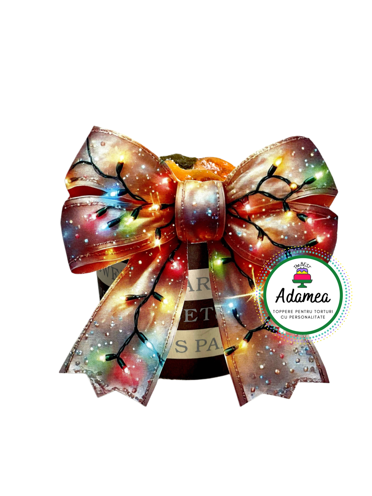 Topperul frontal Fundiță cu Luminițe de Crăciun – 10 × 10 cm este o adevărată explozie de culoare și magie festivă. Designul surprinde farmecul serilor de decembrie: panglici calde, în nuanțe roșiatice-aurii, decorate cu șiraguri de lumini colorate care par să strălucească cu adevărat datorită efectului vizual 3D.