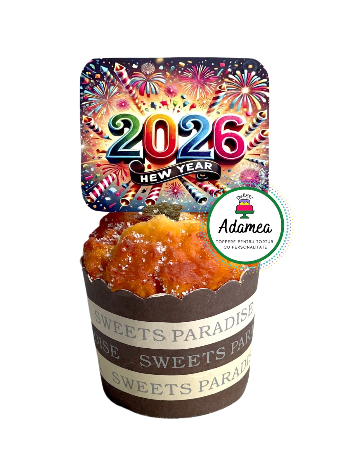 Topperul „2026” cu artificii este o explozie vizuală de culoare, energie și veselie, ideal pentru deserturile pregătite special pentru noaptea de Revelion. Designul din fundal — plin de artificii colorate, lumini, confetti și rachete festive — creează atmosfera unei petreceri spectaculoase, iar cifrele „2026” sunt ilustrate în stil tridimensional, cu nuanțe vibrante și un impact vizual puternic.