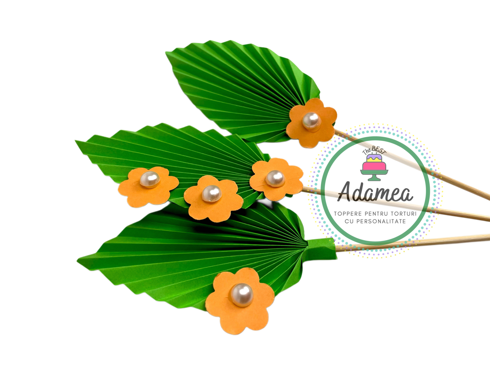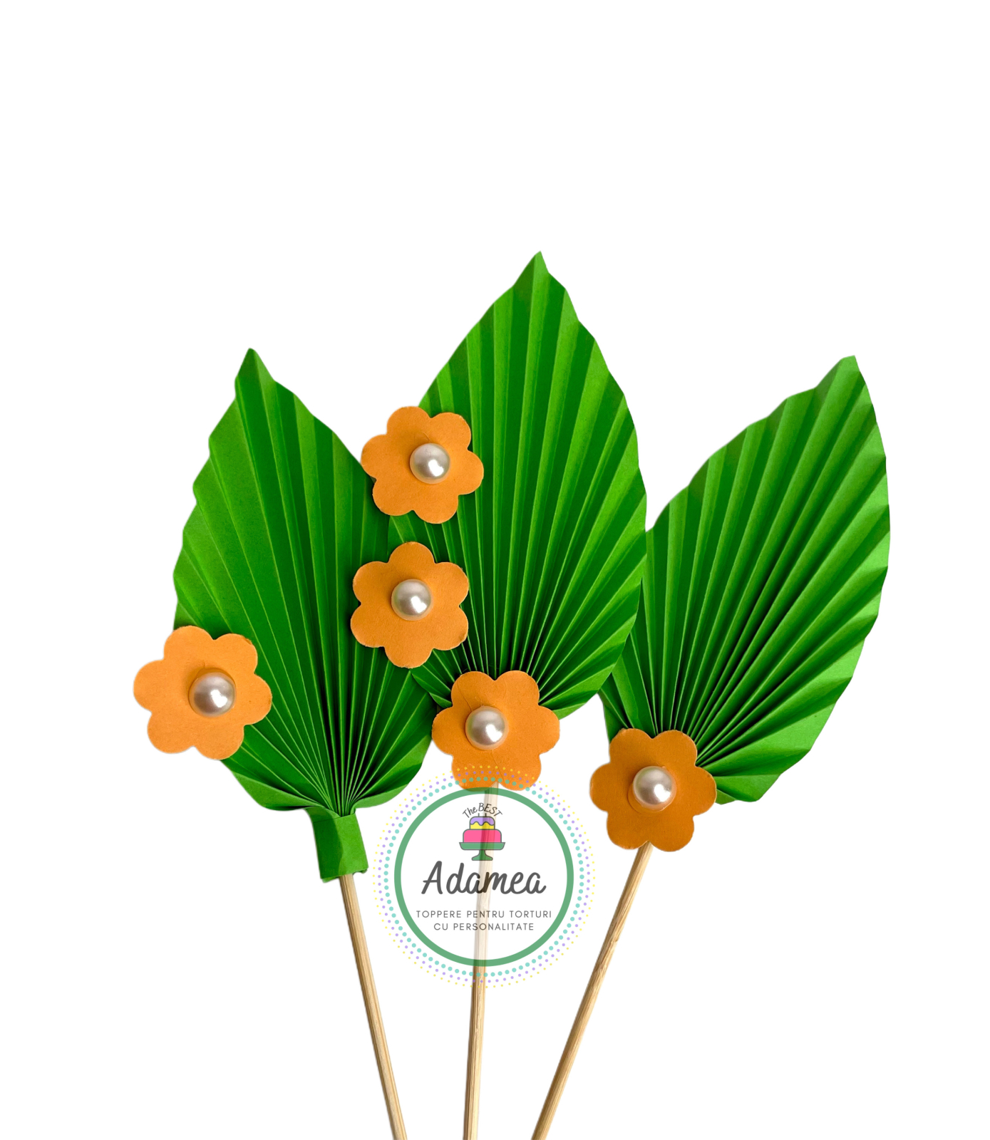 Adamea Aet 3 toppere de tort cu mini evantaie sau frunze de palmier verszi cu floricele portocaliu intens