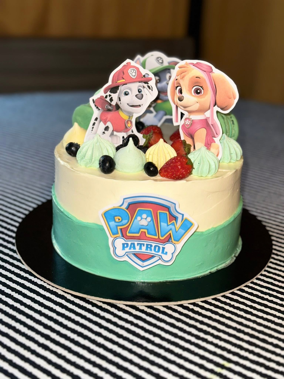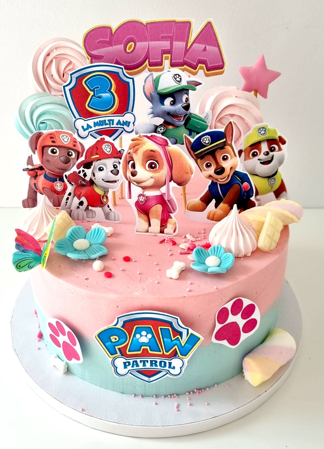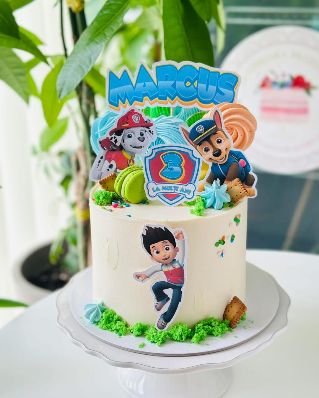 Suită de toppere din carton de 350g/mp cu cele 7 personaje principale din Paw Patrol si logo-ul echipei. Sunt texturate pe o parte, pe spate fiind albe. Cățeii au în medie 10cm înălțime. Logoul se poate face, la cerere, roz (pentru torturile fetitelor).