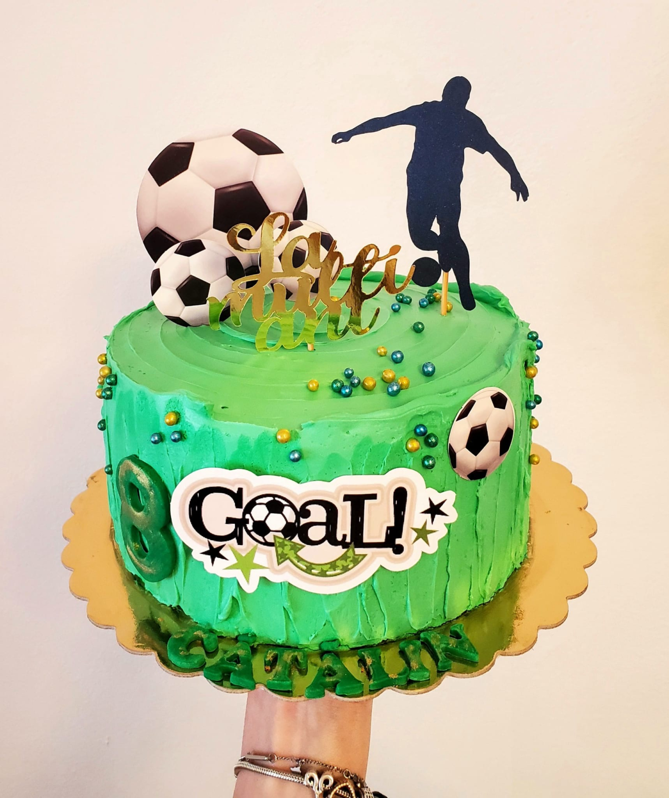 O suită simpatică cu tema fotbal care cuprinde o siluetă de fotbalist, o mingie mare și 3 mai mici și un topper cu GOAL.
