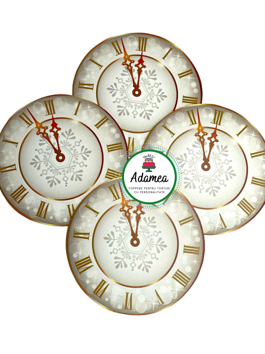 Acest topper sub formă de cadran de ceas aduce pe tort o notă elegantă și simbolică, ideală pentru evenimentele de iarnă și pentru momentele speciale dintre ani. Fundalul crem, decorat cu un fulg stilizat și cifre cu aspect cald și rafinat, creează un contrast plăcut și o estetică echilibrată, ușor de integrat în decoruri clasice sau festive.