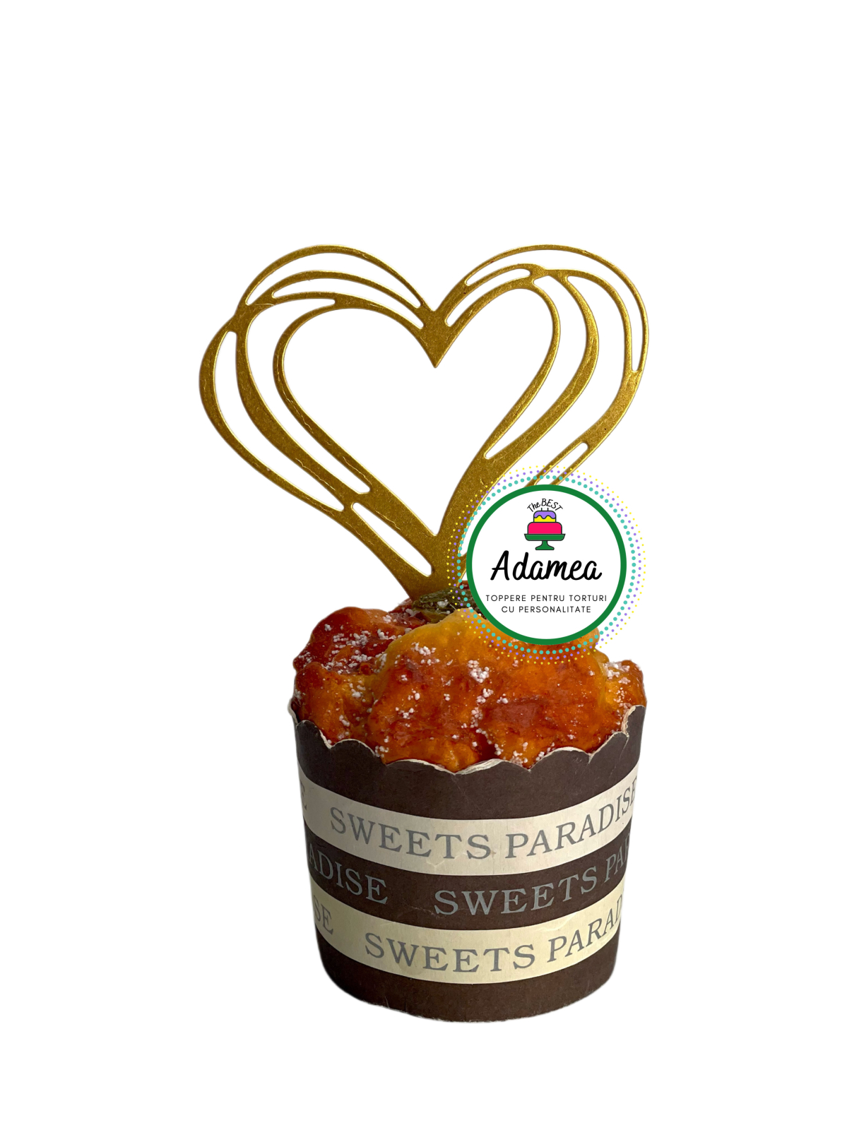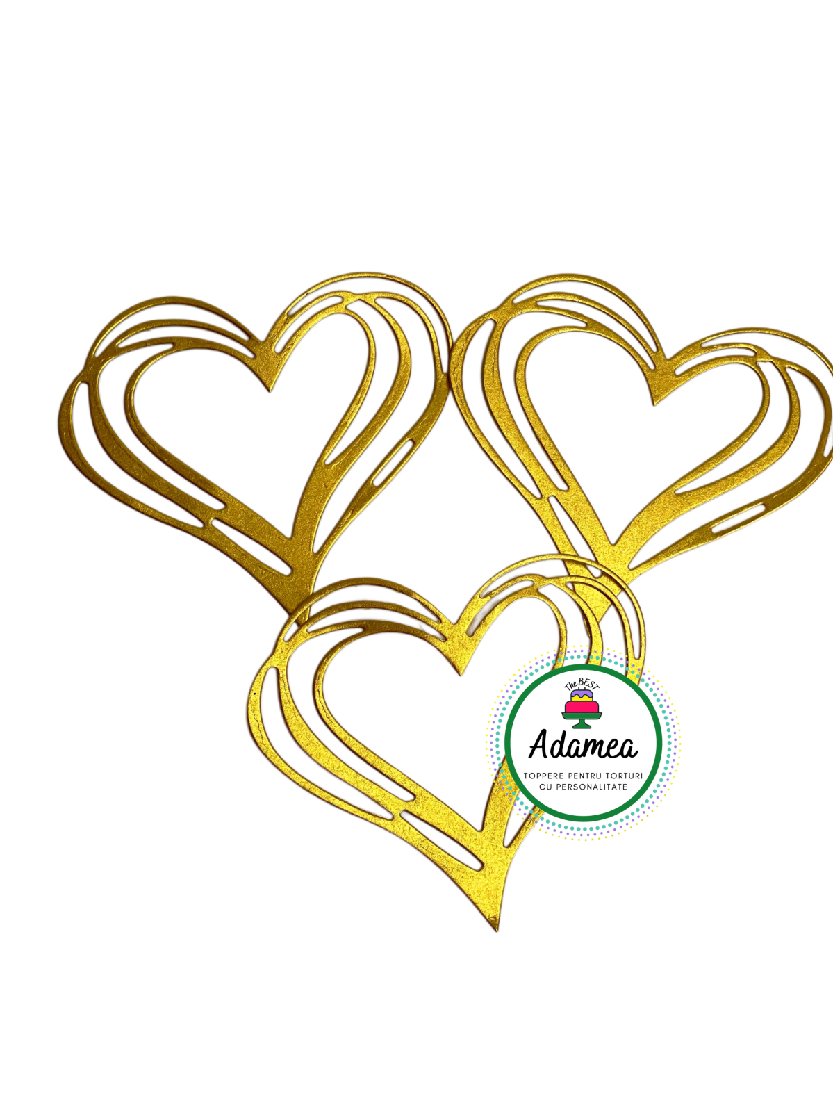 Topperul este realizat din carton special auriu cu efect sidef, decupat cu precizie într-un design aerisit, ce lasă tortul să „respire” vizual. Dimensiunile sale sunt 8 cm înălțime și 9 cm lățime, fiind potrivit atât pentru torturi mici, cât și pentru torturi etajate.