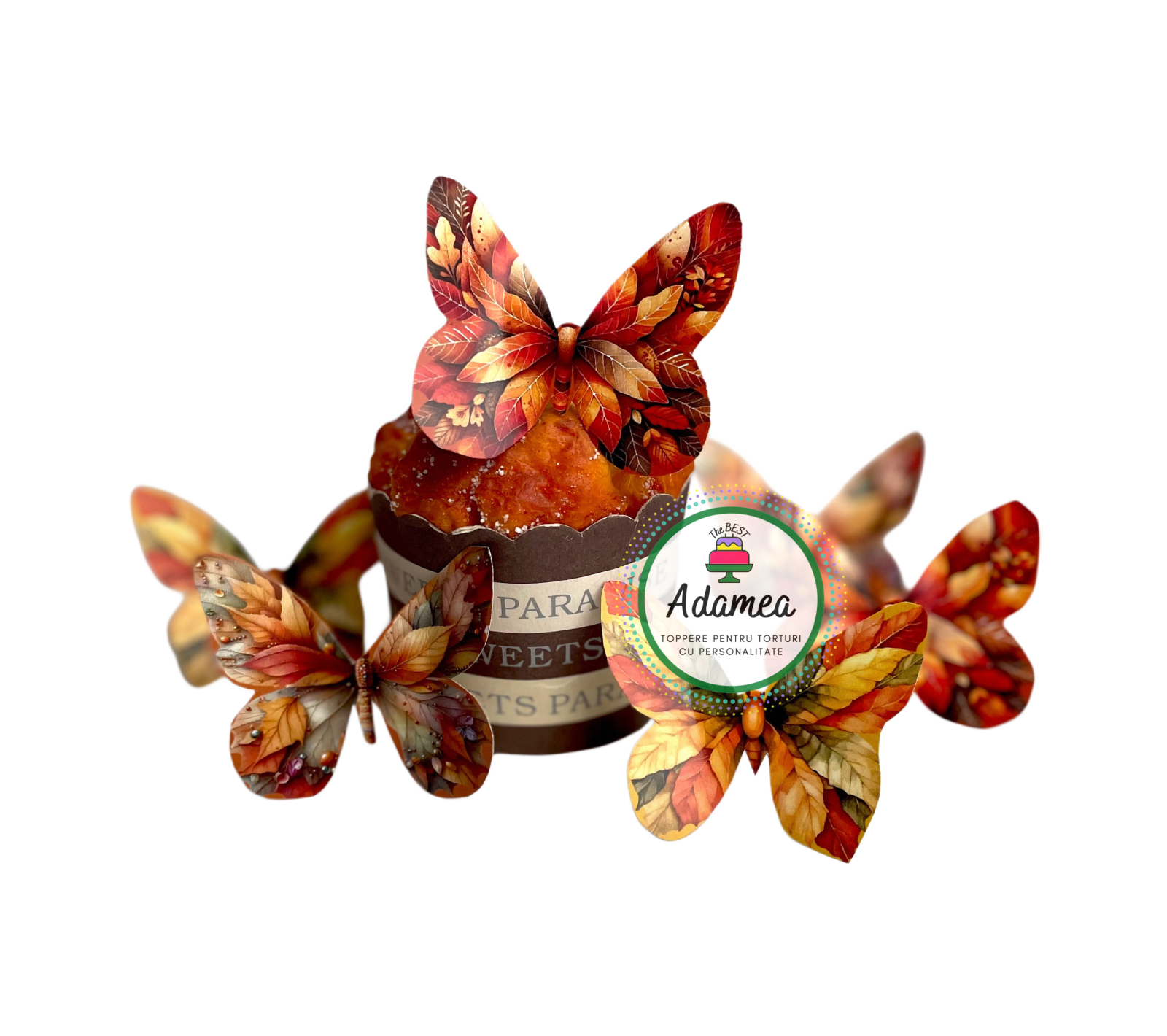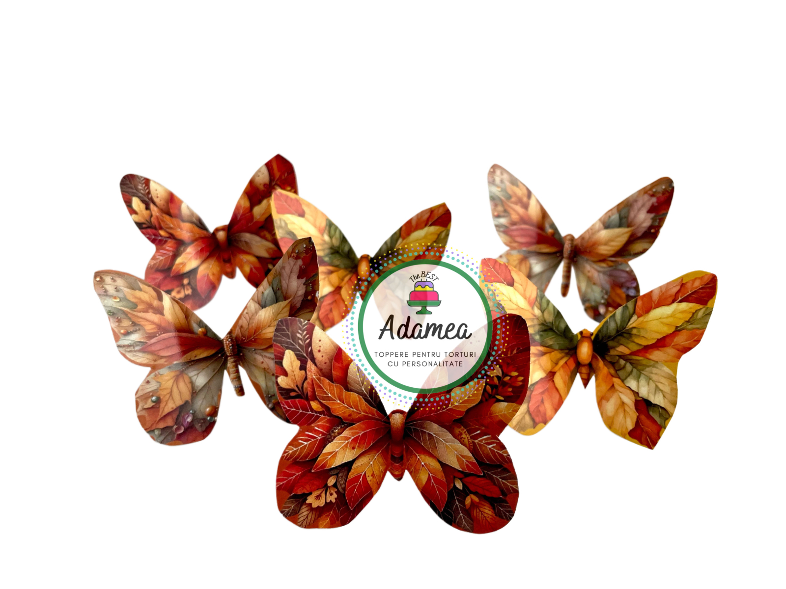 Fluturii sunt realizați din carton premium texturat, imprimat în culori calde de toamnă, cu spatele alb.