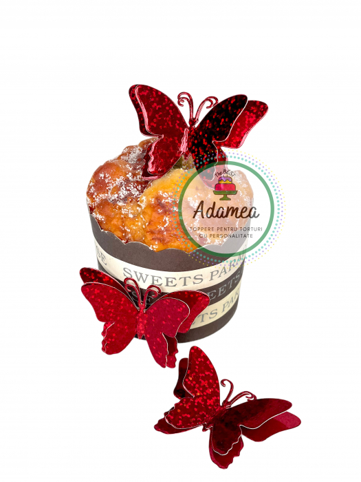 Set de toppere de tort cu 3 fluturi dublati, 3D. Sunt realizați din carton heliomat, în mii de culori sclipitoare și carton cu efect roșu oglindă. Vin dotați cu sistem de prindere laterală pe tort.