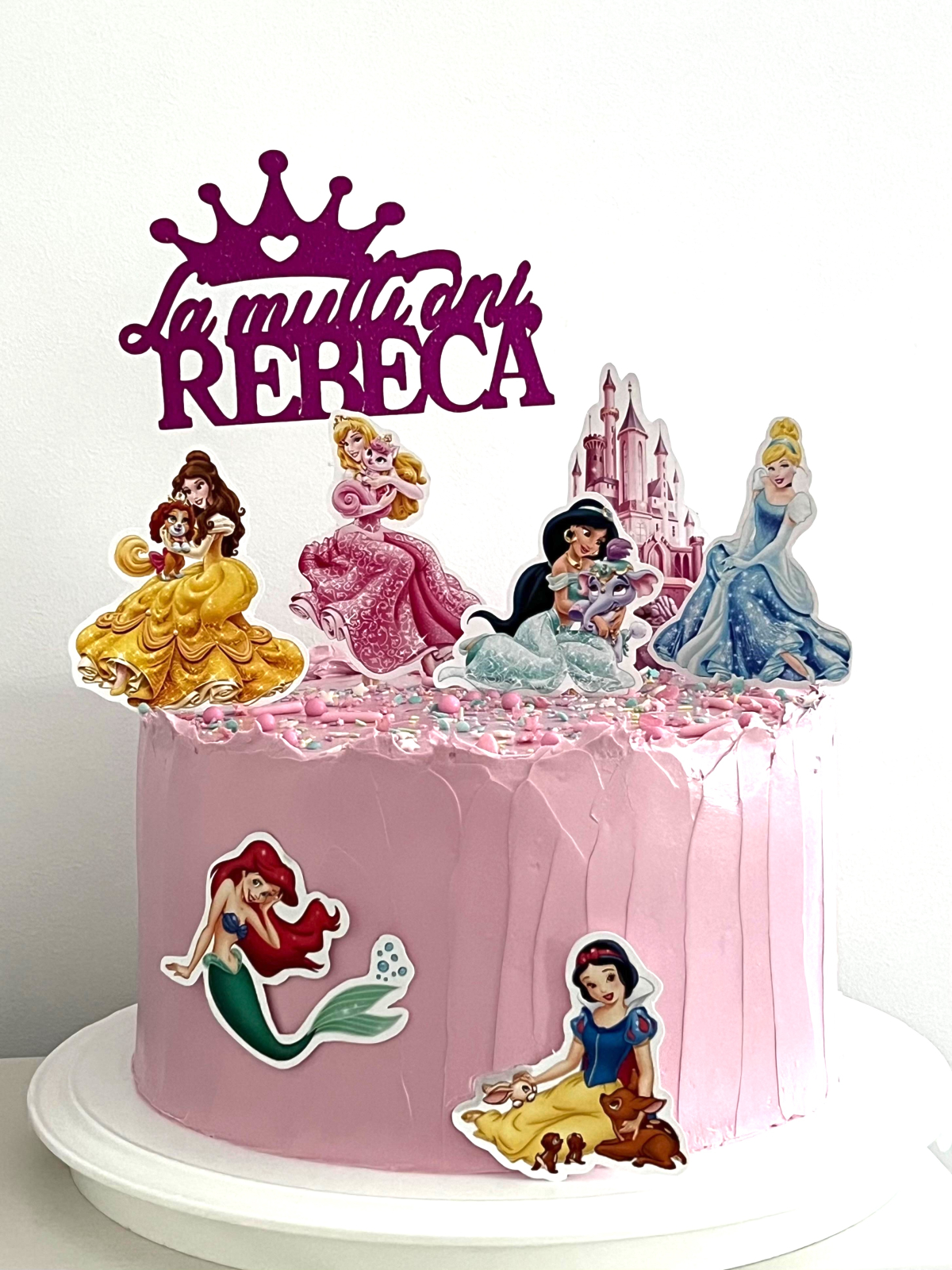 Suită de toppere din carton cu 6 printese si un castel Topperele sunt texturate pe o parte, spatele lor fiind alb. Suita ciprinde un castel (în jur de 13cm înălțime) și 6 prințese: Albă ca Zăpada, Aurora, Jasmine, Cenușăreasa, Belle și Ariel.