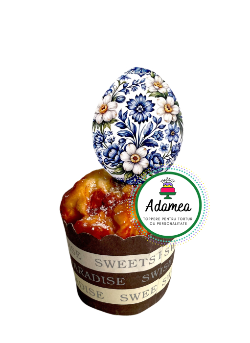 Un ou încondeiat cu flori, în tonuri fine de albastru și alb, ca o mică piesă de sărbătoare așezată pe tort. Modelul floral are un aer delicat, curat și elegant, iar finisajul oferă acel aspect luxos care se vede imediat în fotografii. Este un decor premium care aduce un plus de rafinament deserturilor de Paște și evenimentelor de sezon, fără să încarce compoziția.