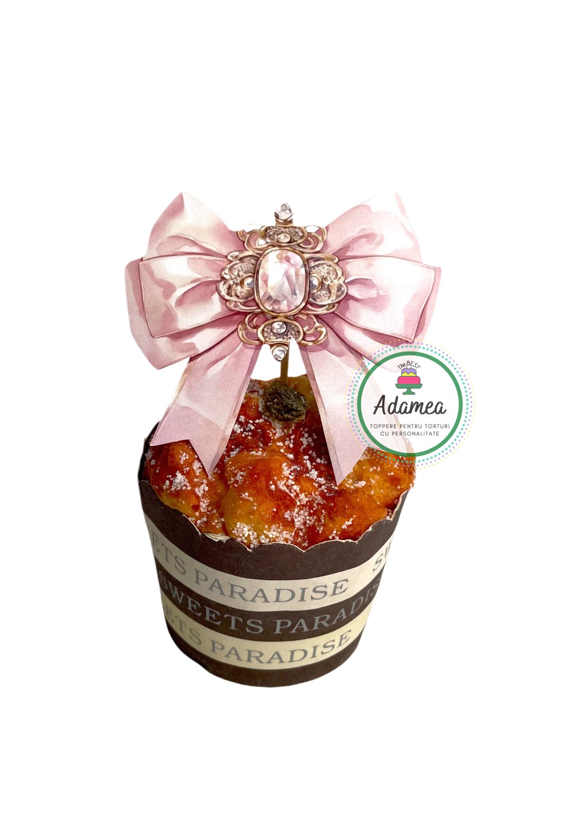 Rafinat, elegant și plin de feminitate — topperul de tort cu fundiță roz pal tip bijuterie transformă orice tort într-o piesă de bijuterie comestibilă.